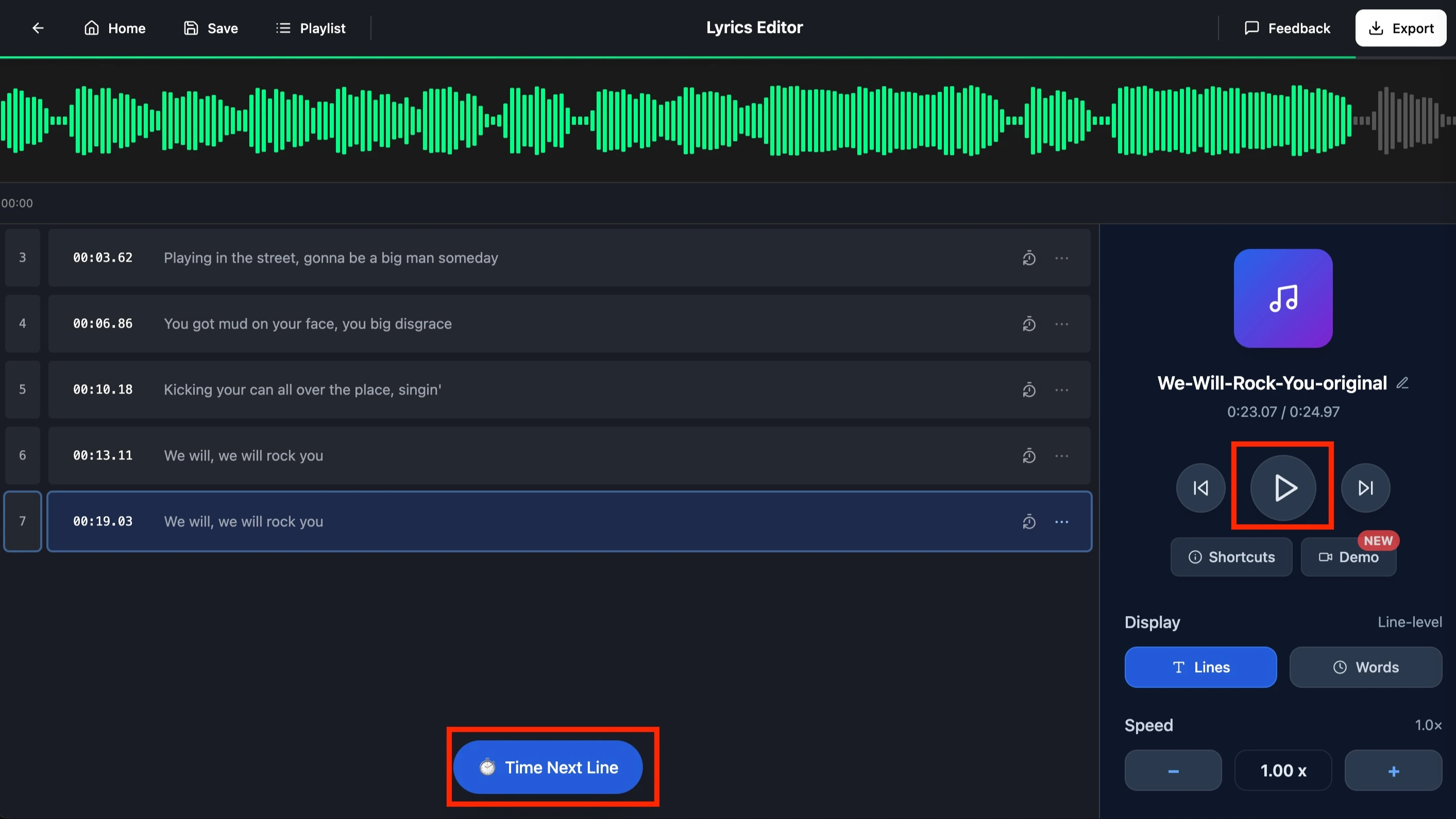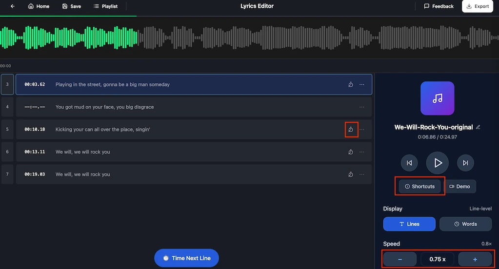 Step 4: Click "►" to play the song, listen to the vocals and click "Time Next Line" to mark the timestamp