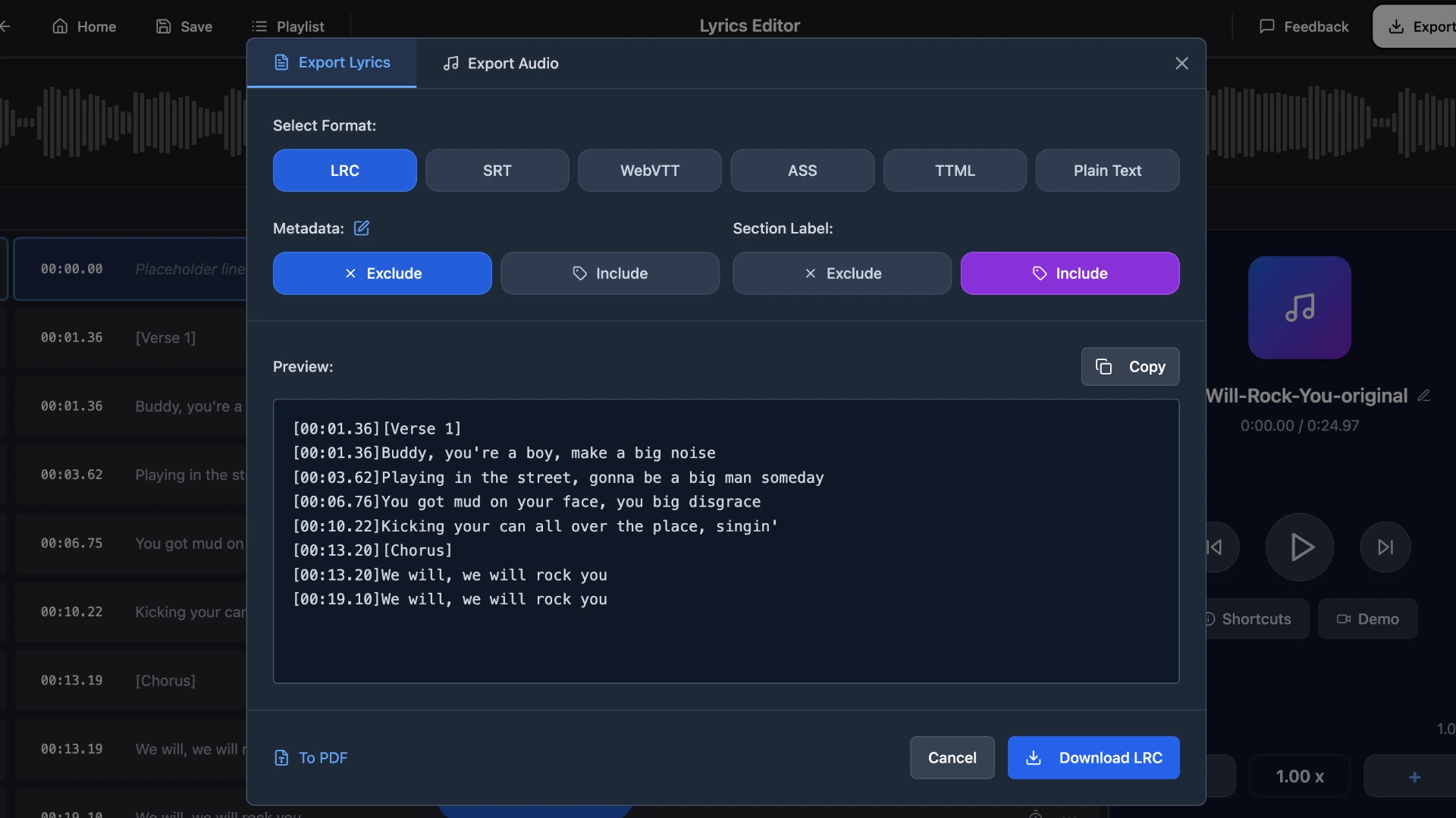 Step 5: Export the .lrc file from the Editor and use it